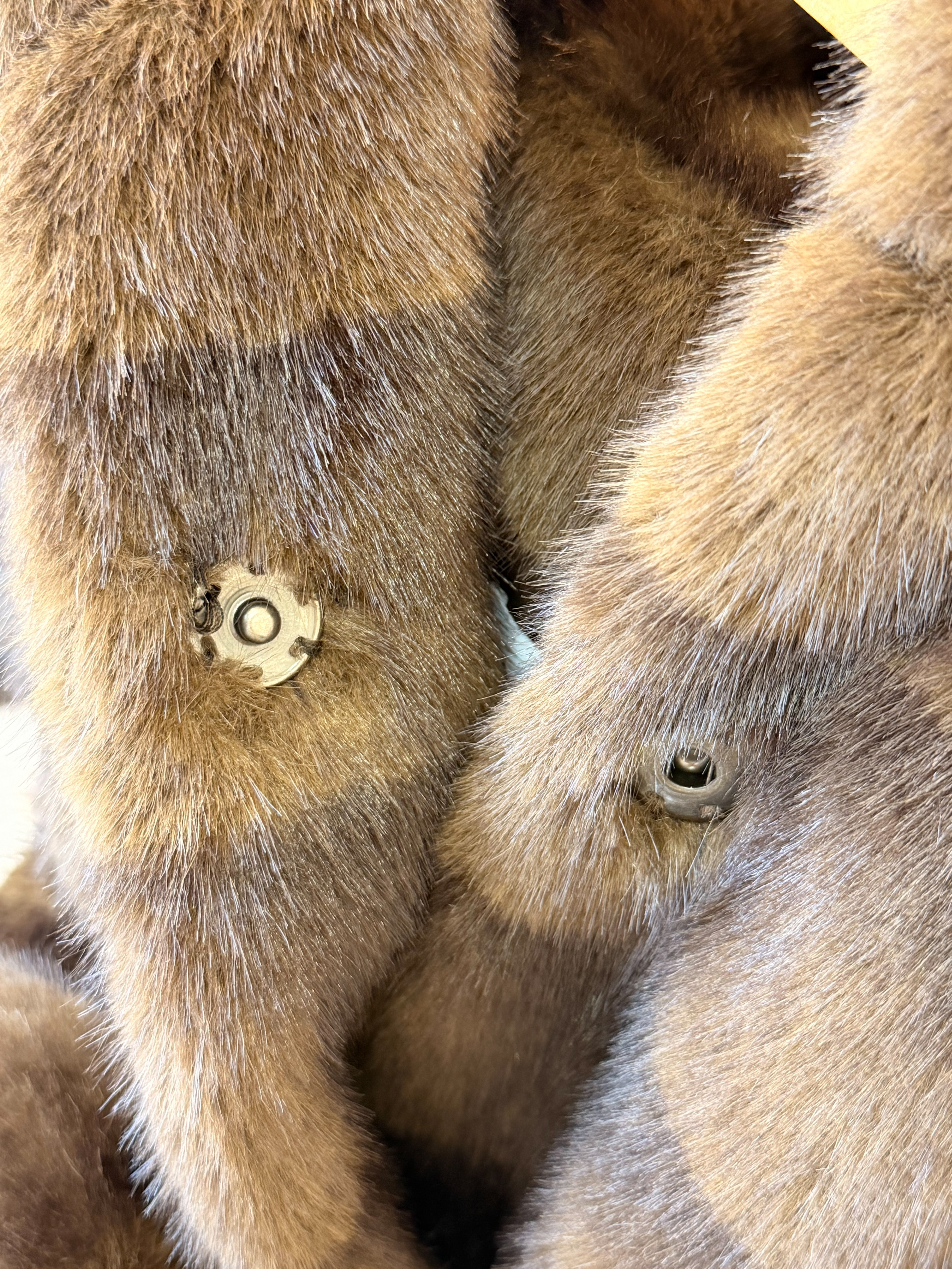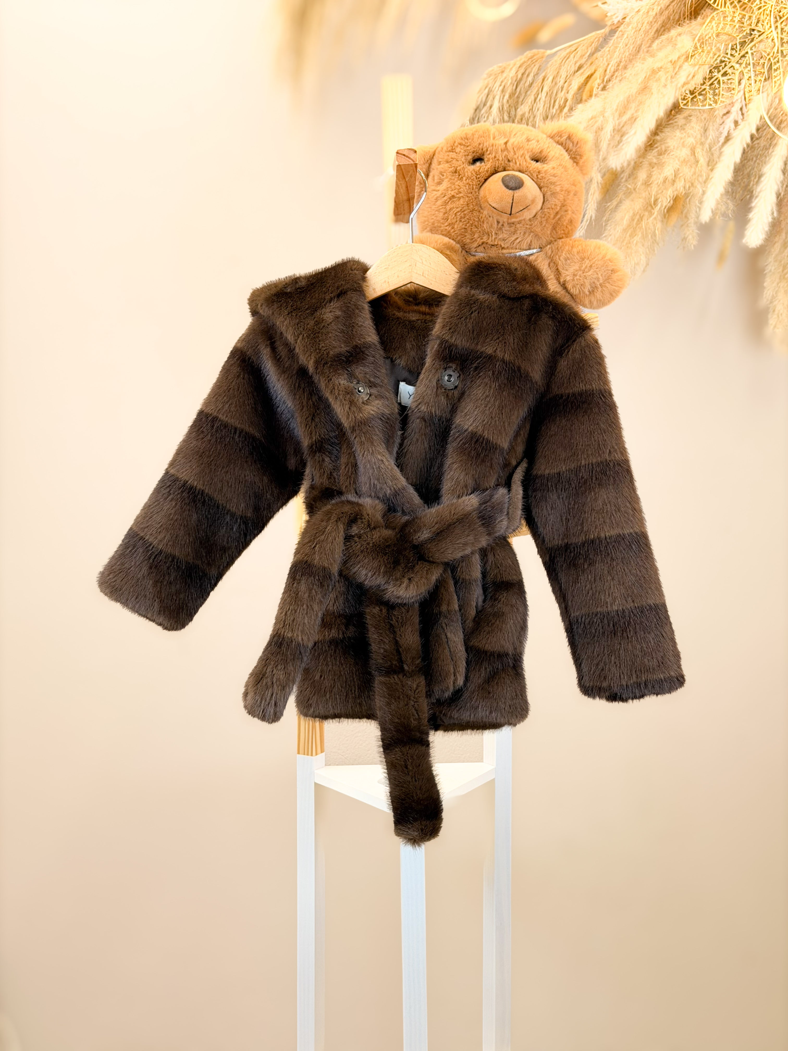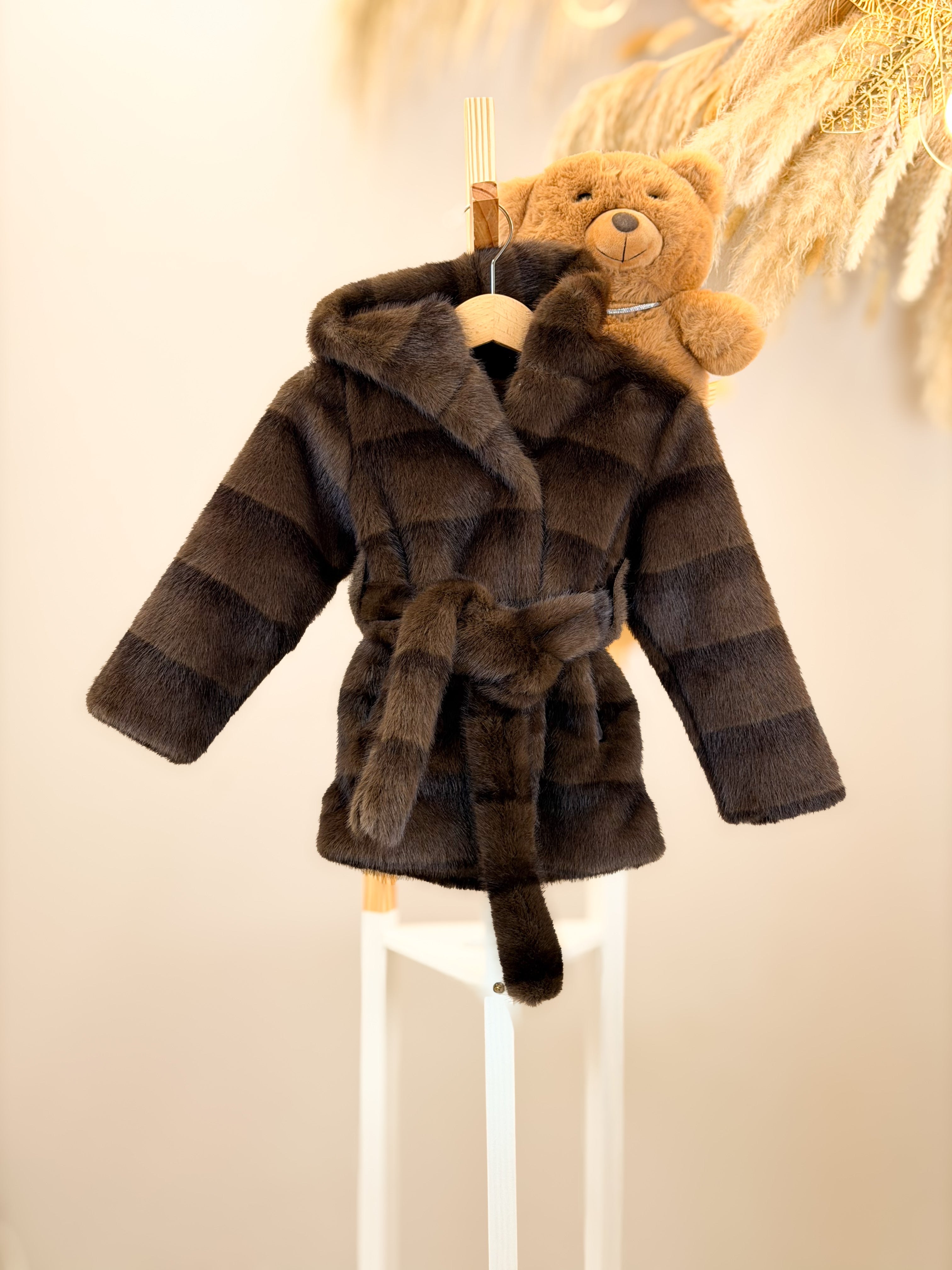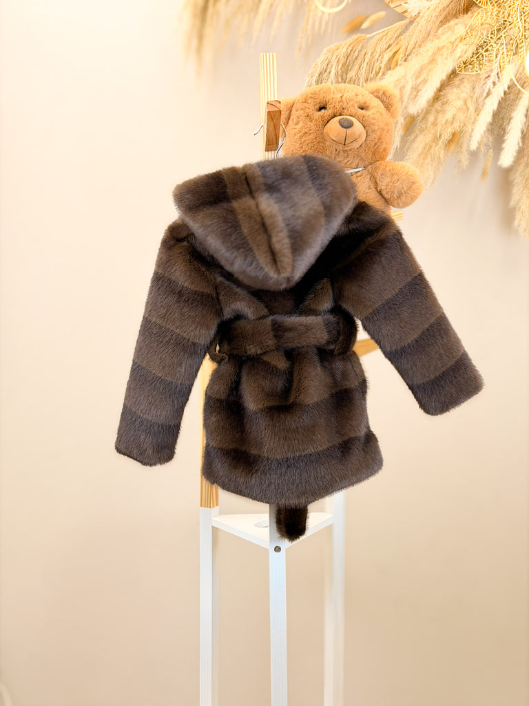 Pelliccia Eco colore Coffè con cappuccio bottoni e cintura in vita.