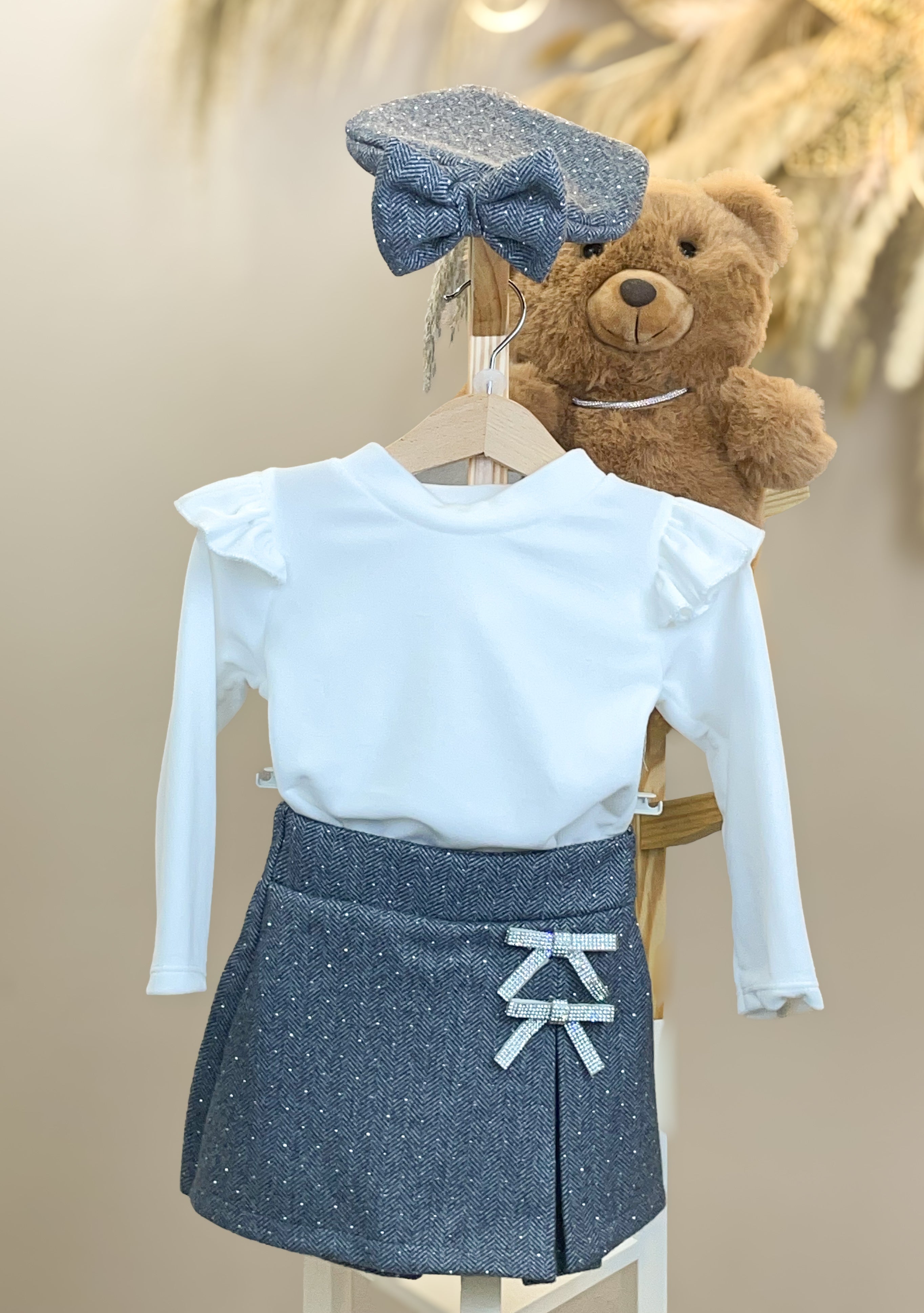 Pantagonna in lanetta brillantinata con fiocchi removibili, maglia vellutata bianca con volant spalle, basco con fiocco coordinato al Pantagonna