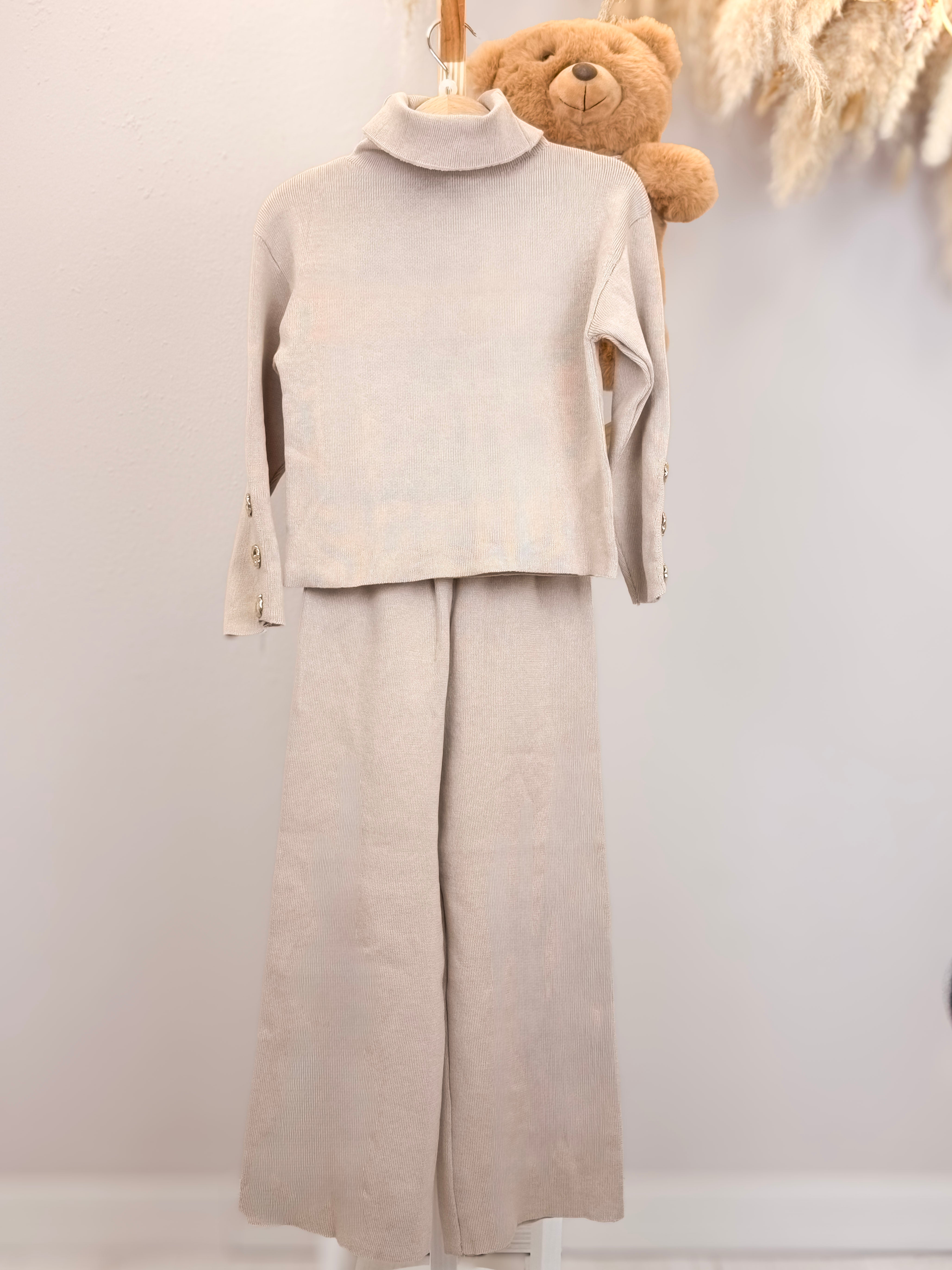 Tonalità beige neutrale che si abbina facilmente con il resto del guardaroba. Un set versatile per la stagione, adatto sia a occasioni casual che semi-formali.