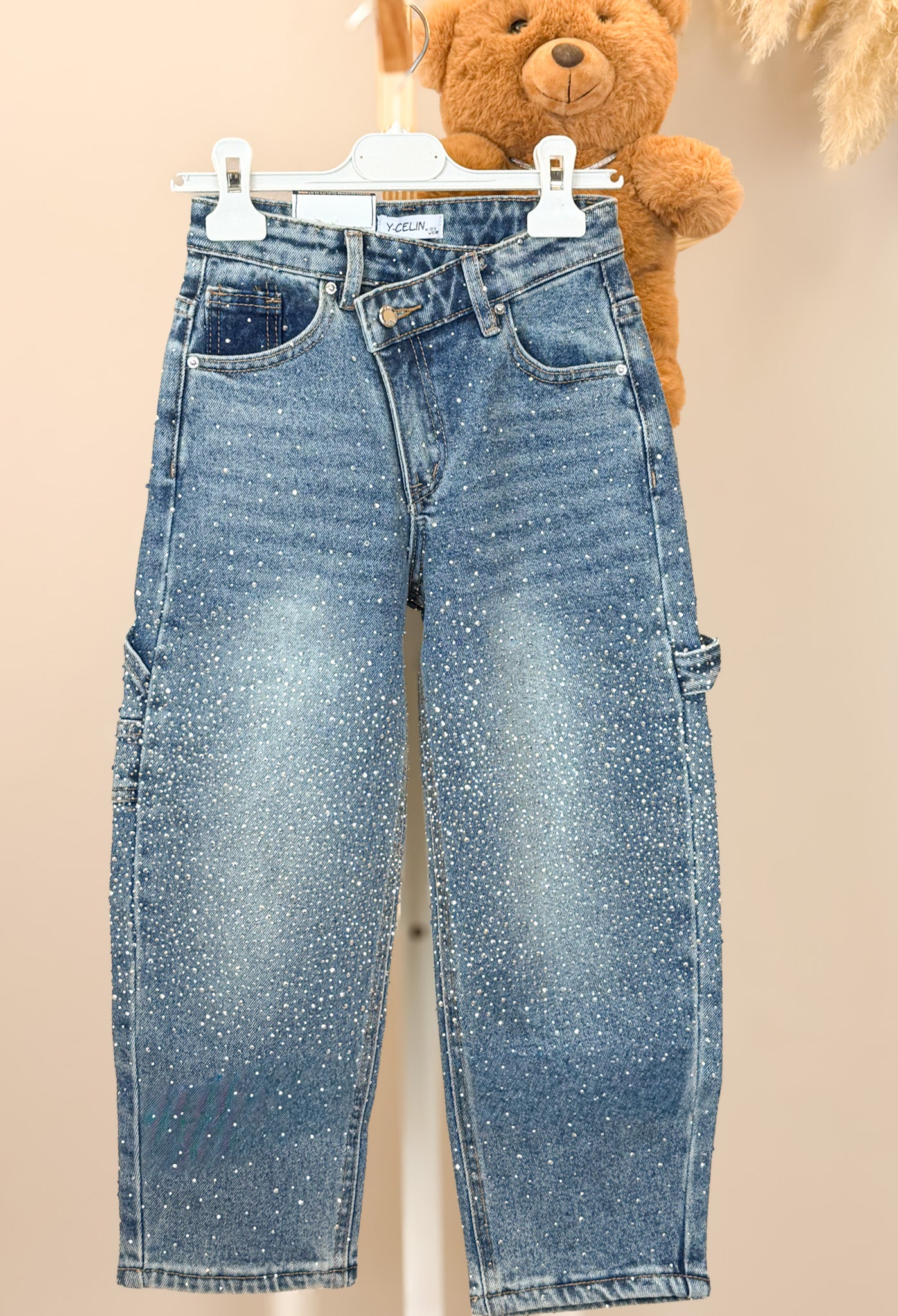 Denim modello balloon con chusura trasversale tempestato di brillantini
