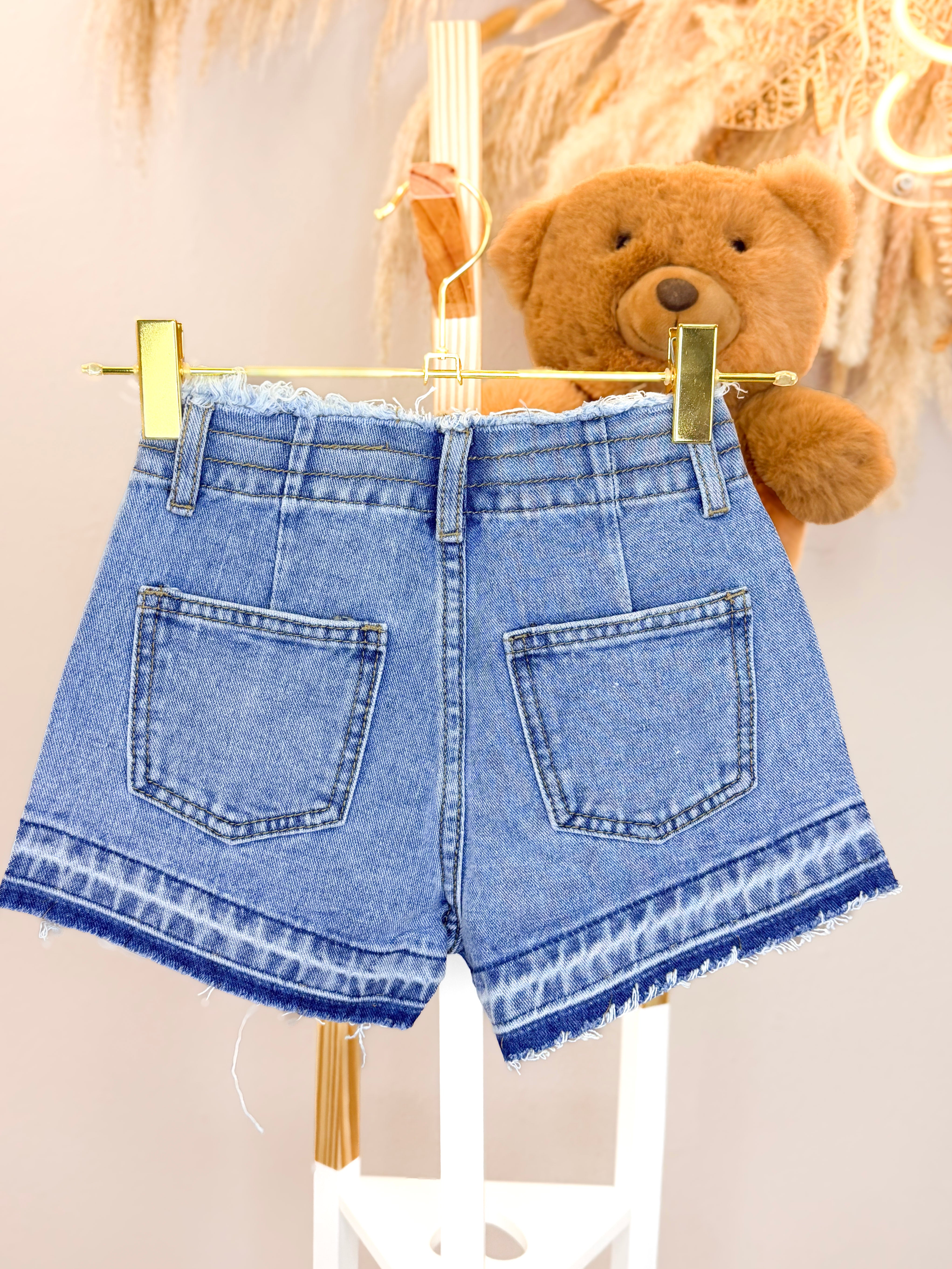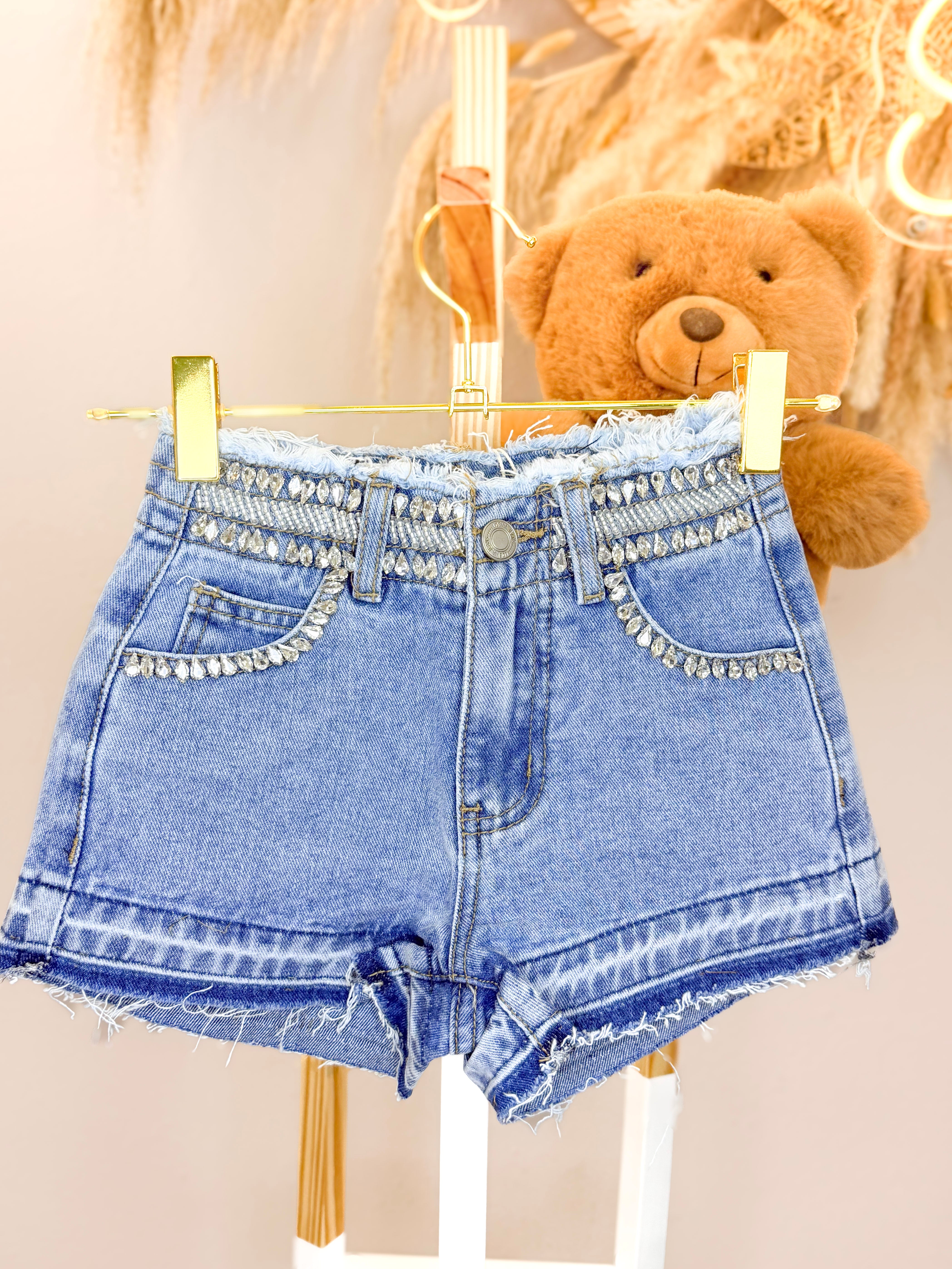 Pantaloncino in denim con dettagli scintillanti che catturano lo sguardo. Una cintura di strass in rilevo abbellisce la vita, mentre ulteriori cristalli decorano il bordo delle tasche per un tocco glamour. Pratico e versatile, presenta una cerniera e bottone con interno regolabile per una vestibilità confortevole e personalizzata. Perfetto per chi desidera aggiungere un elemento di lusso al proprio guardaroba casual.